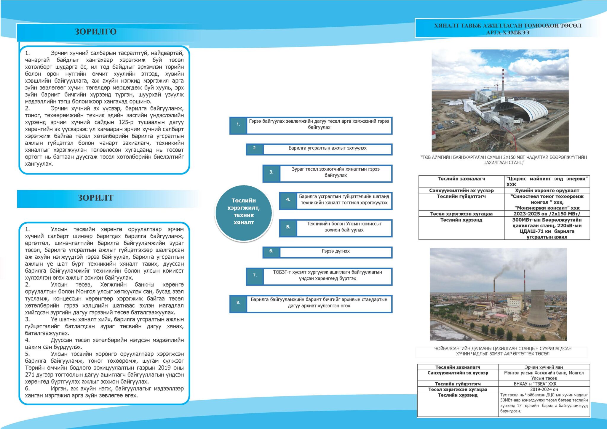 Эрчим хүчний эх үүсвэр, барилга байгууламж, тоног, төхөөрөмжийн техник эдийн засгийн үндэслэлийн хүрээнд хөрөнгийн эх үүсвэрээс үл хамааран эрчим хүчний салбарт хэрэгжиж байгаа төсөл хөтөлбөрийн барилга угсралтын ажлын гүйцэтгэл болон чанарт захиалагч, техникийн хяналтыг хэрэгжүүлэн төлөвлөсөн хугацаанд нь төсөвт өртөгт нь багтаан дуусгаж төсөл хөтөлбөрийн биелэлтийг хангуулах.